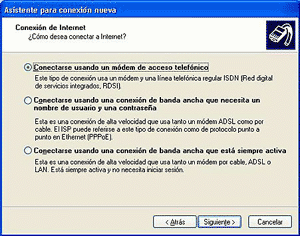 usando un módem de acceso telefónico" y vuelva a hacer click en "Siguiente". |